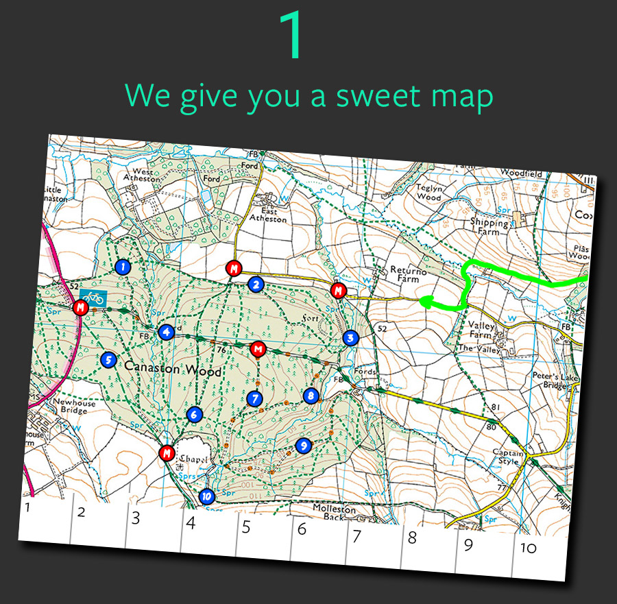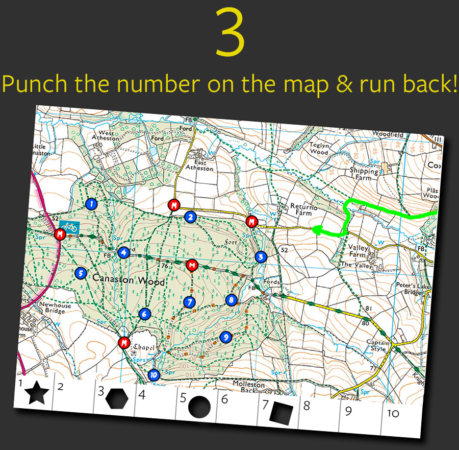 Each dot represents a flashing beach ball hanging in the woods. This dots on this map are for demonstration purposes only, you’ll be given the real dot locations at the start of the race 🙂